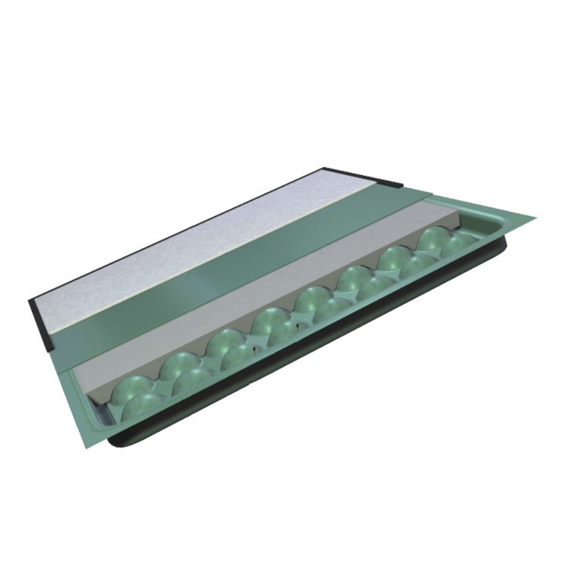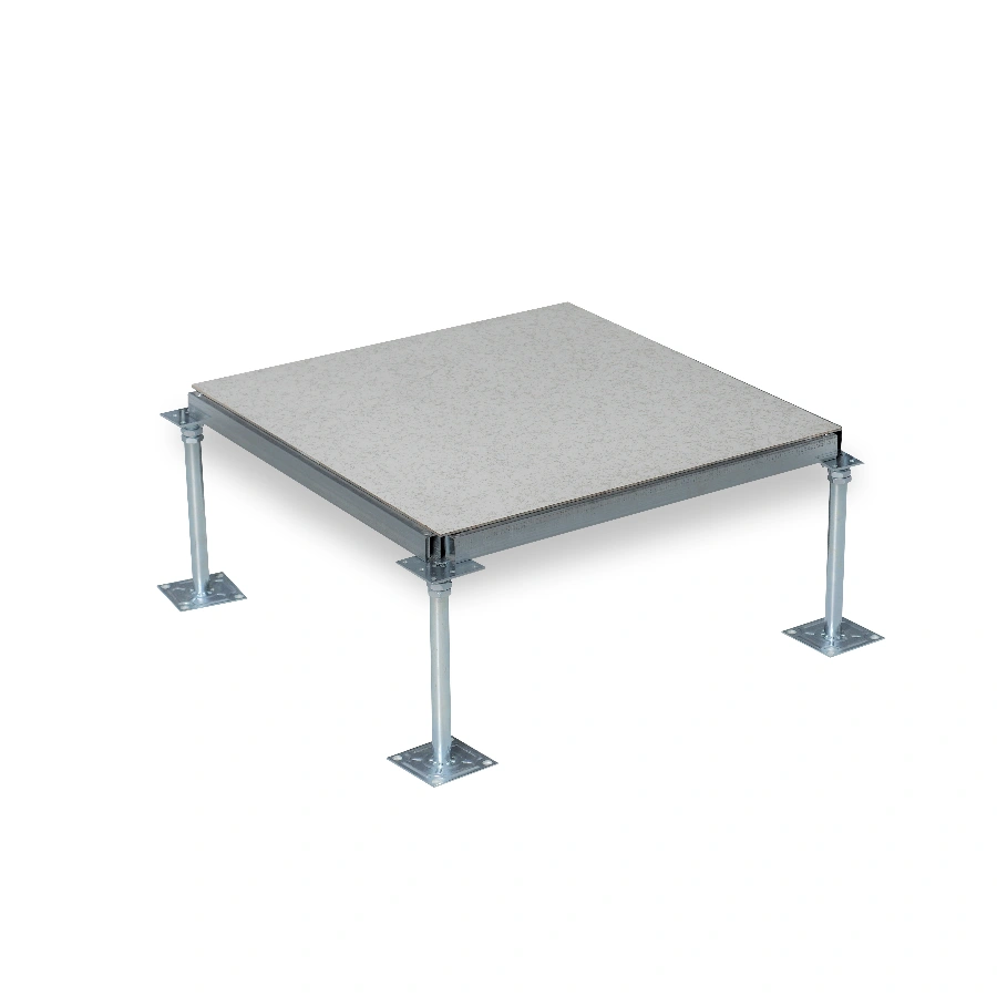 底板采用深级拉伸钢板,面板采用硬质 SPCC 钢板,上下钢板冲压、点焊成形,外表经磷化后进行喷塑处理,中间空壳填充发泡水泥,经过养护后形成稳定的承载结构,上表面可粘贴高耐磨防静电 HPL 贴面,搭配联网支架和方管横梁,螺钉组装。