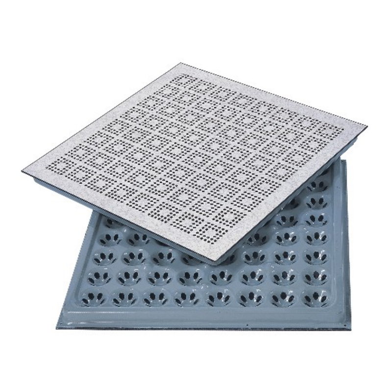 采用优质钢板经拉伸、冲孔、点焊、喷塑工艺成型,内腔空心并放置加强型格栅, 表面粘贴 HPL 三聚氰胺防静电贴面或 PVC 防静电贴面。 产品通风率达 22%,可根据使用需求配备通风调节器, 满足 0~22% 不同等级的工业通风要求,并可配套防静电全钢高架活动地板使用。